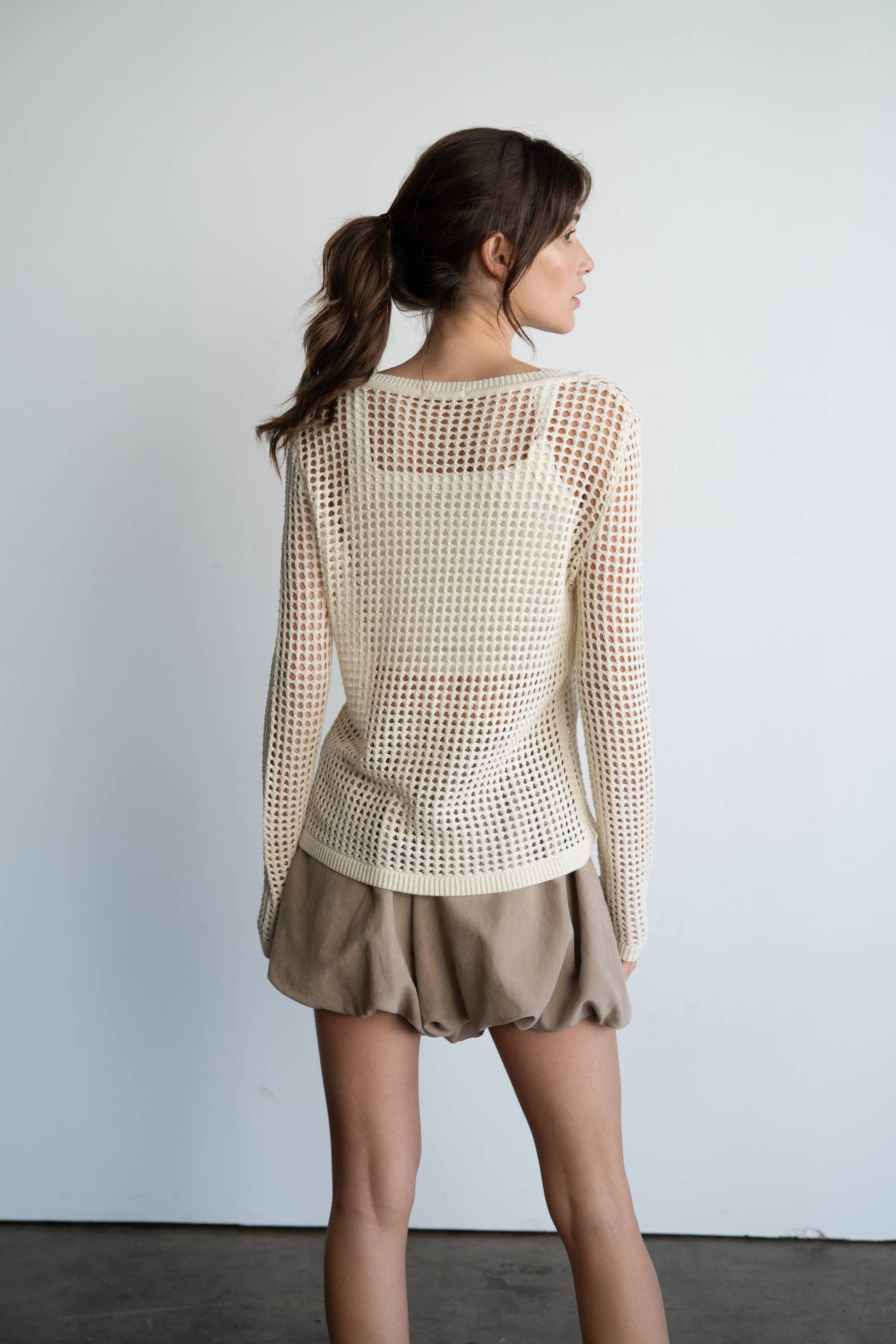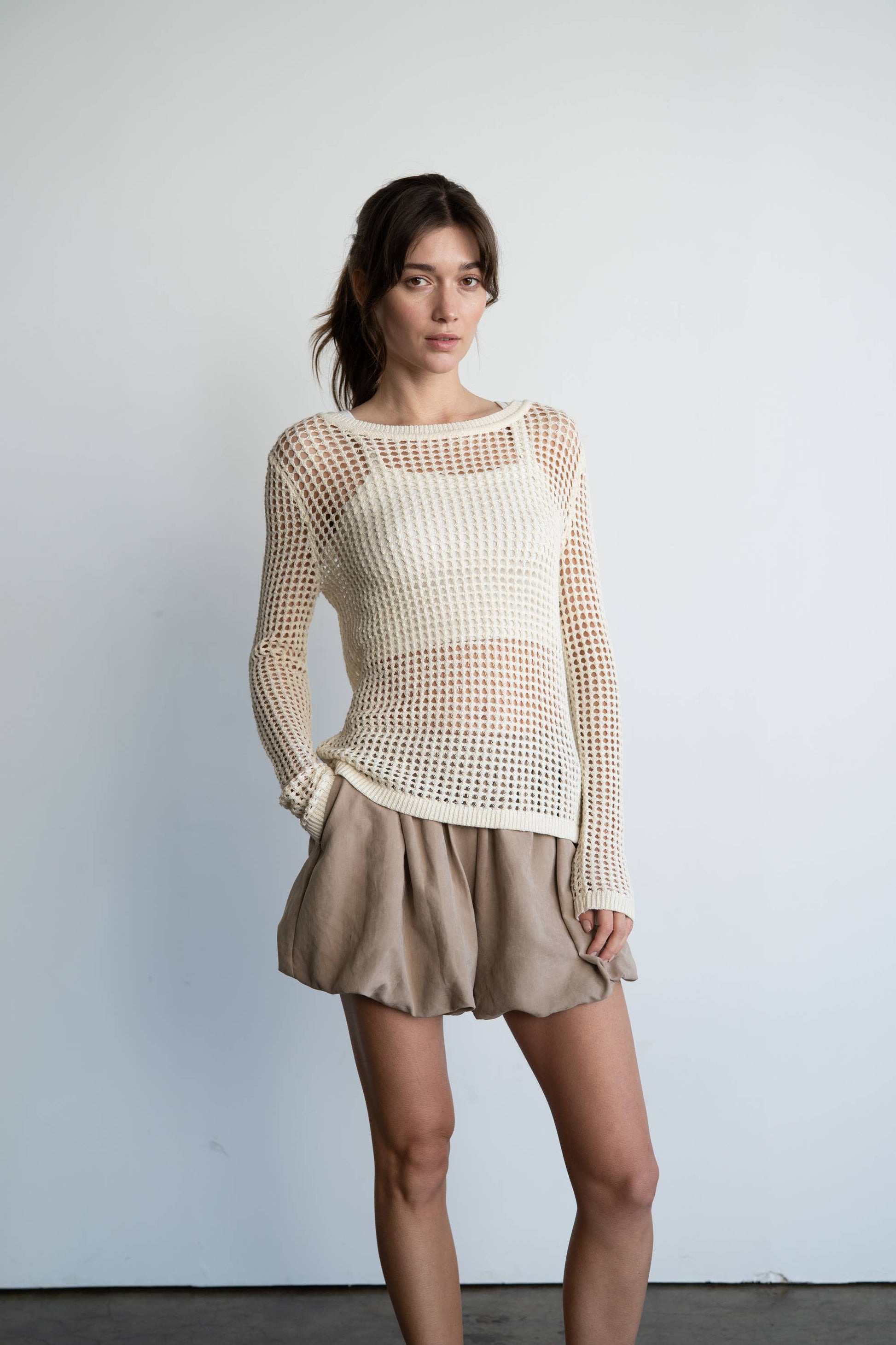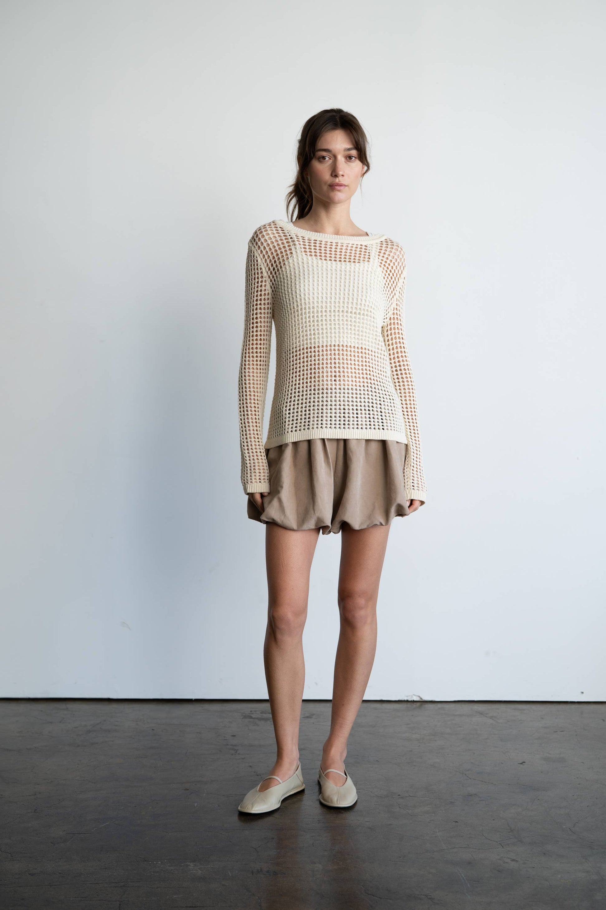 Lightweight bubble hem shorts with a voluminous silhouette - Taupe beige tone for a versatile neutral base - Elastic waistband with a relaxed fit for comfort - Soft, flowy fabric with subtle sheen - Stylish option for summer layering or casual outings