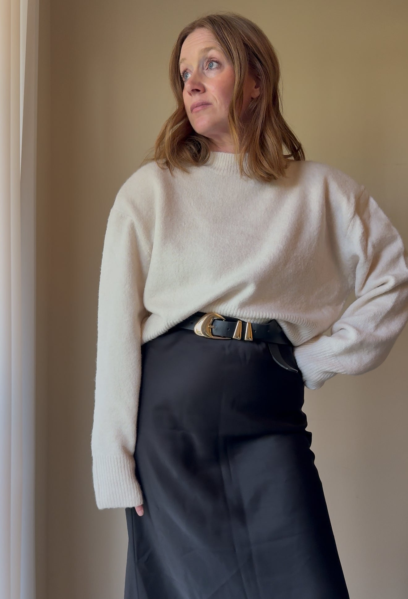 A mock-neck knit sweater featuring subtle shoulder pads for added structure. Finished with ribbed detailing at the neckline, cuffs, and hem for a polished, modern look.