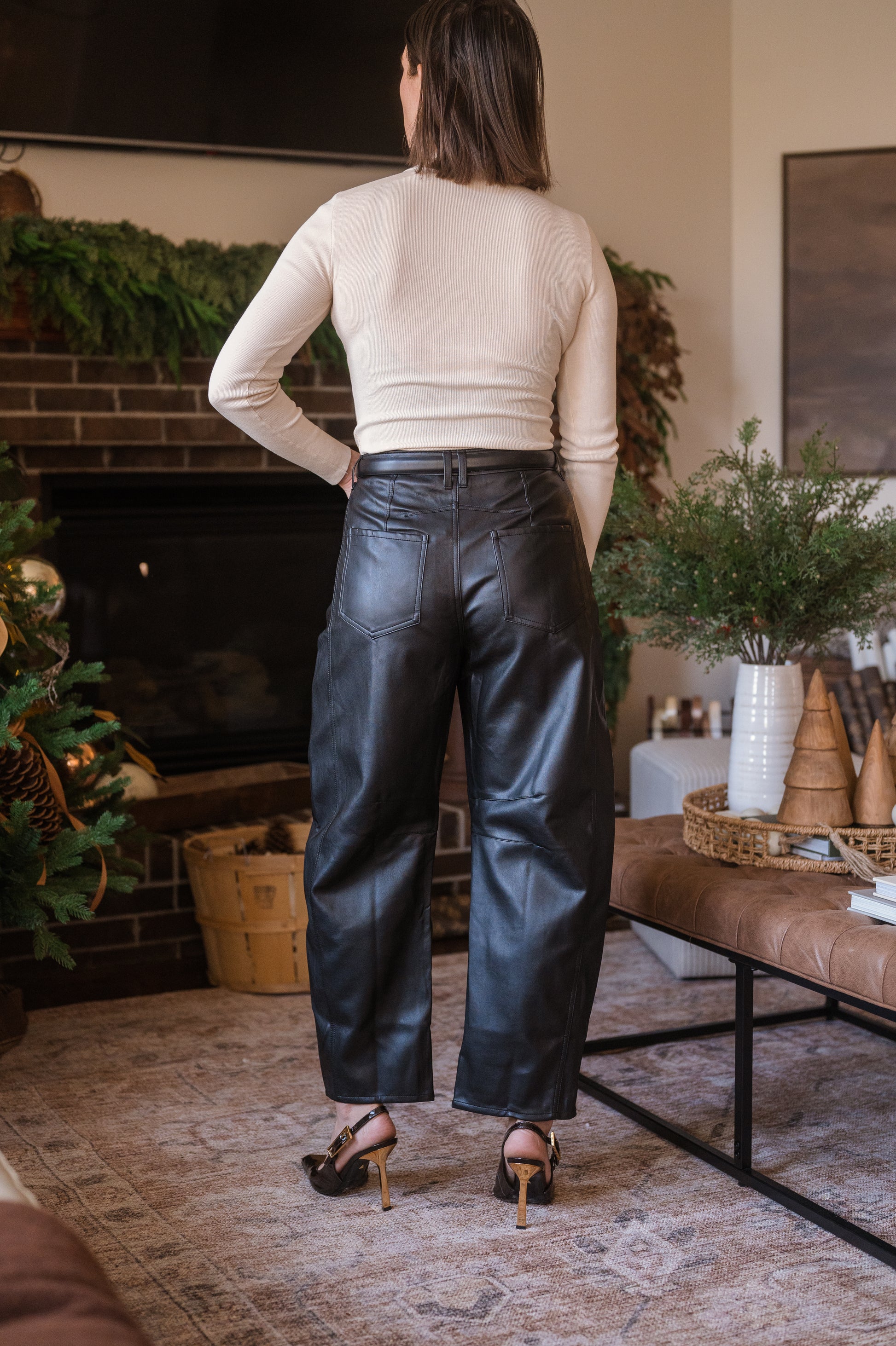 Vegan leather barrel pants are a trendy leather pants. They feature a barrel-shaped silhouette with a slightly tapered leg, giving them a modern, relaxed fit. The vegan leather material provides the sleek, edgy look of leather. These pants are perfect for adding a bold statement to any outfit, whether paired with a simple top or layered with oversized sweaters and jackets. They offer versatility for both casual and dressed-up occasions, combining style with conscious fashion.