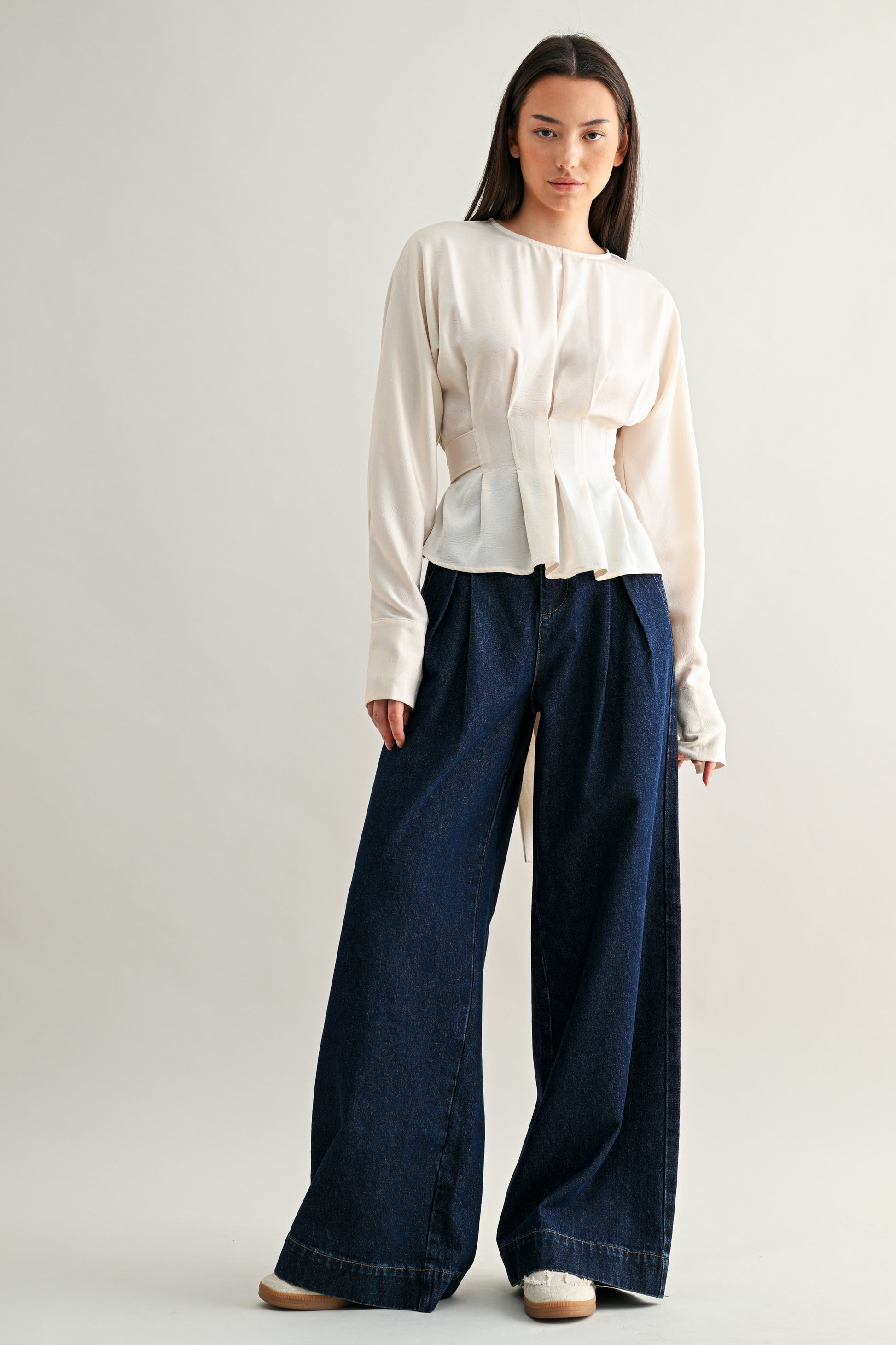 The Holland & Bloom High Class Ivory Blouse features a graceful tie-back design with delicate pleats, sculpted into a soft satin like peplum silhouette that enhances your elegance. This blouse combines classic tailoring with modern sophistication, making it an ideal choice for refined everyday wear or special occasions.