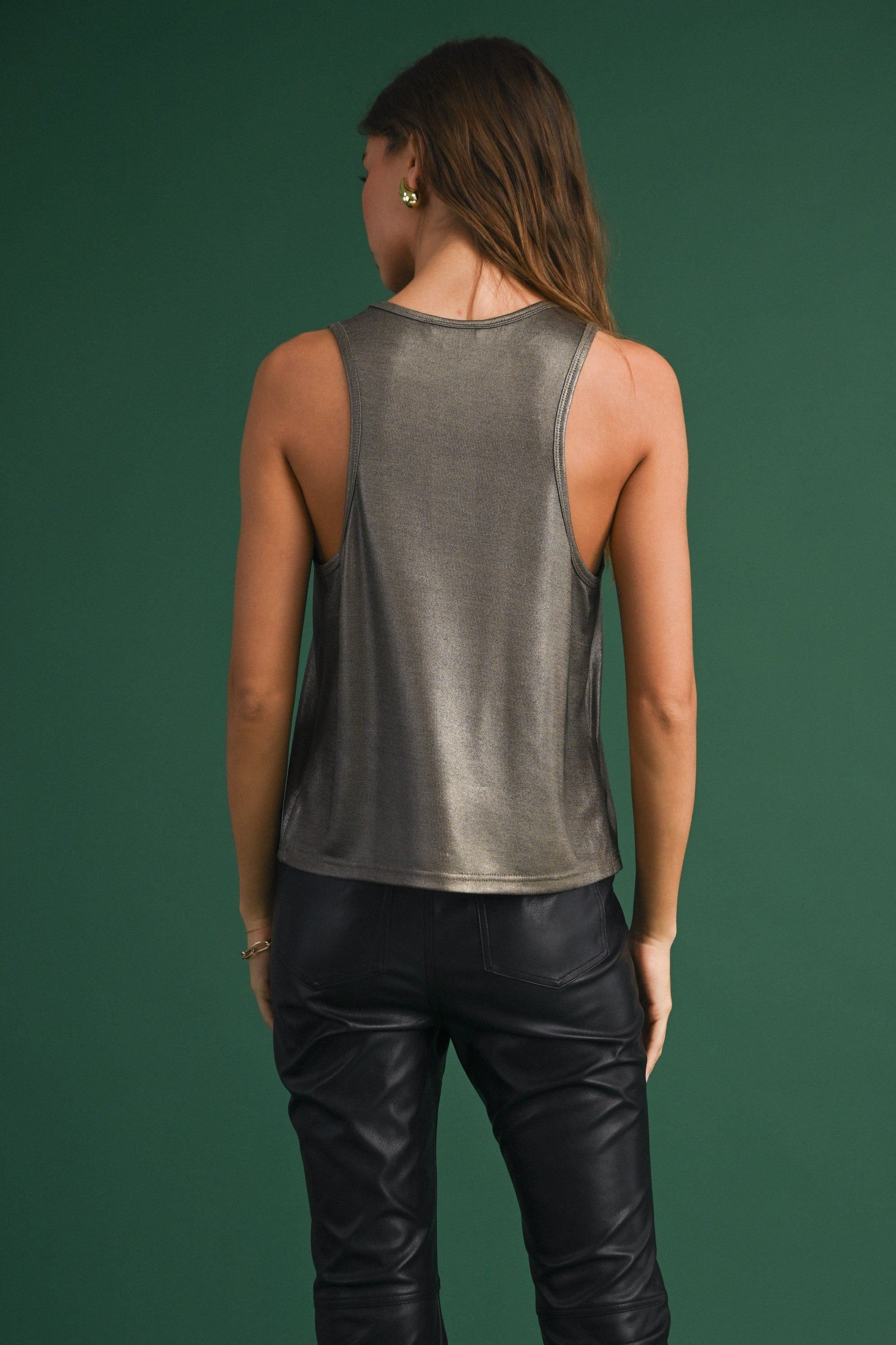 Tap into the world of luxury with this Metallic Laser Back Bronze Tank. Crafted with premium fabric, the shimmering bronze hue is elevated with the intricate laser cut back design. Bring sophistication to your wardrobe with this timelessly elegant piece.