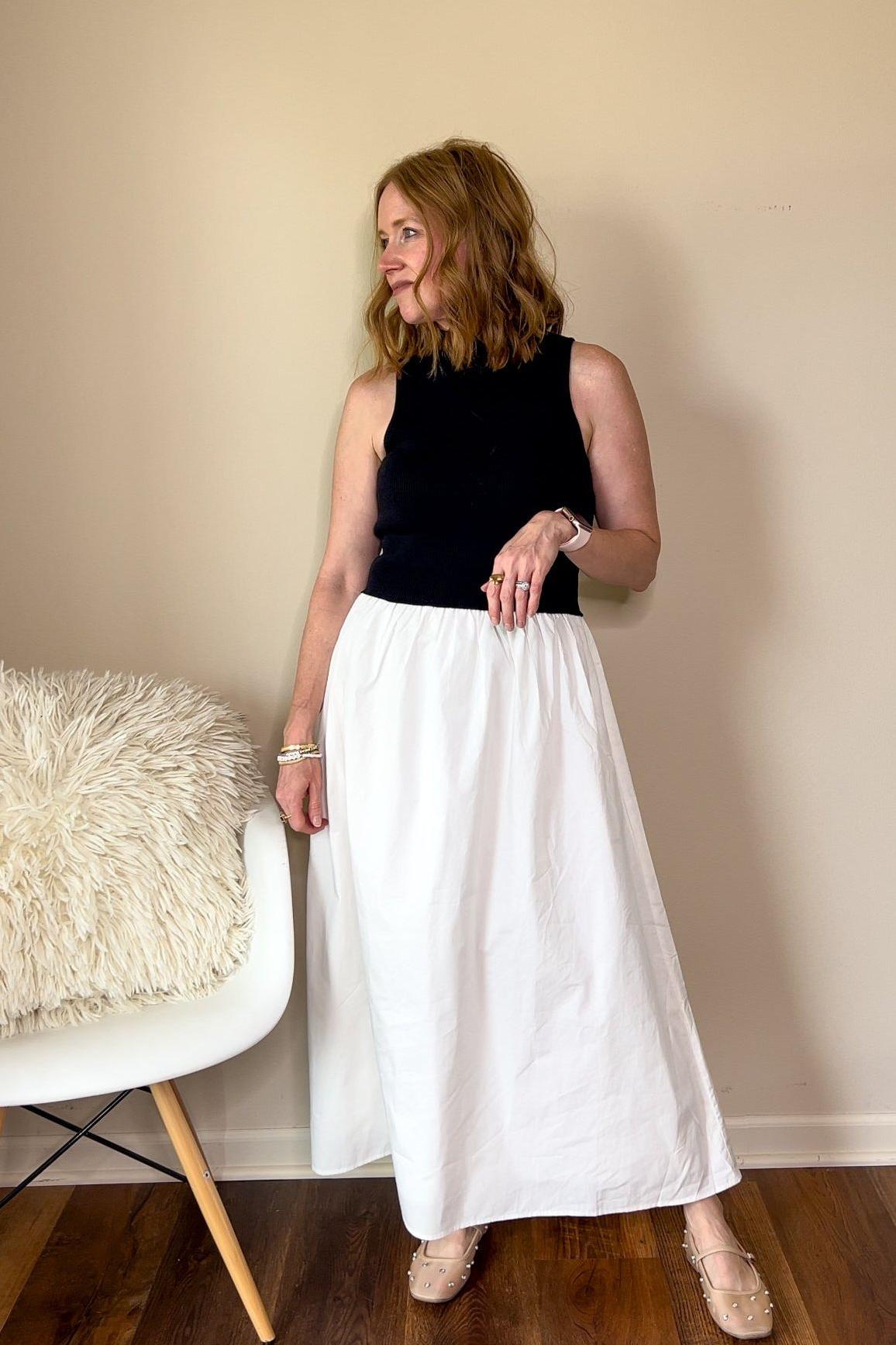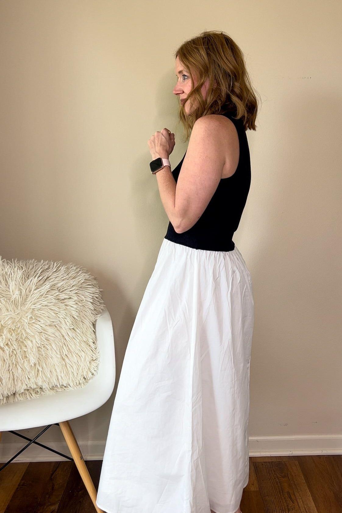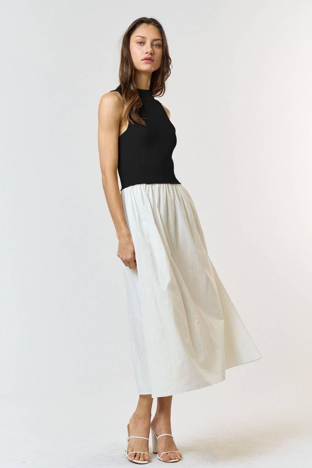 Indulge in the luxurious contrast of our Mixed Media Dress. A combination of black sweater knit and poplin bottom creates a striking visual and tactile experience. Perfect for a sophisticated night out, this dress exudes elegance and exclusivity.
