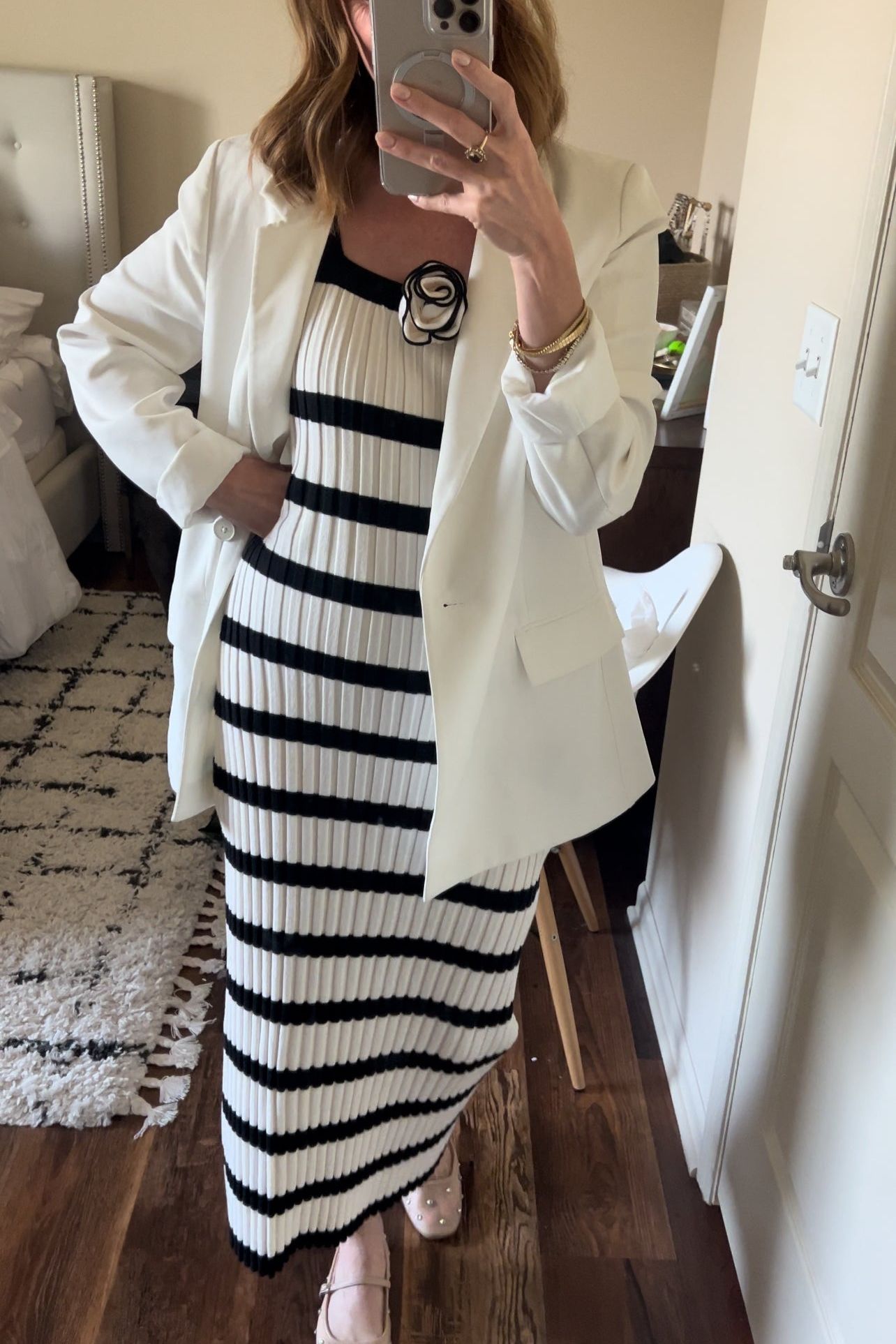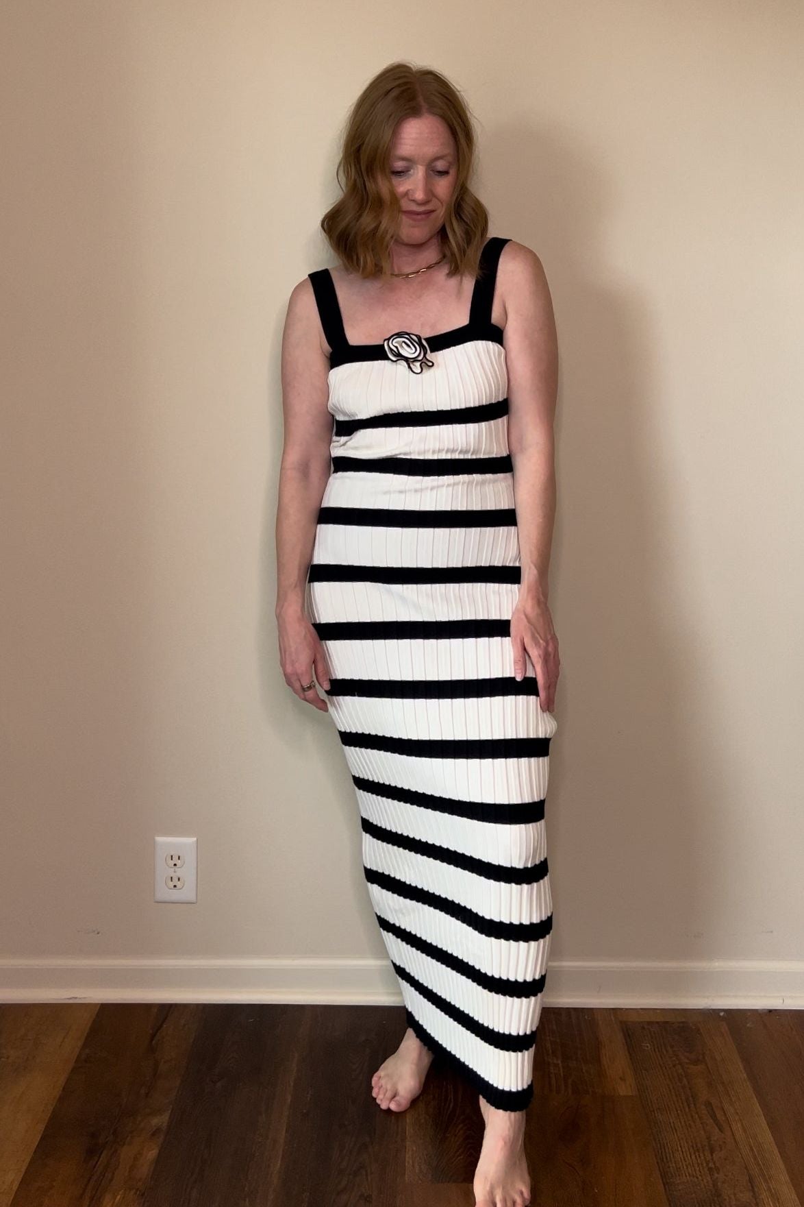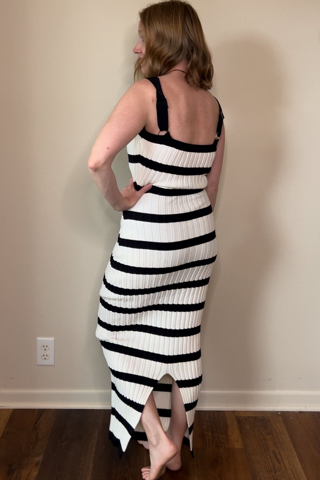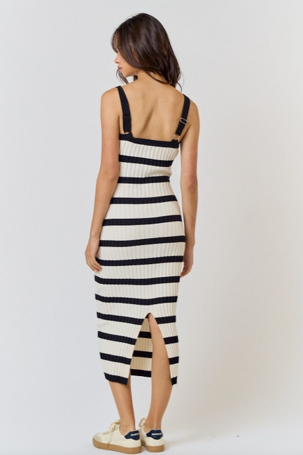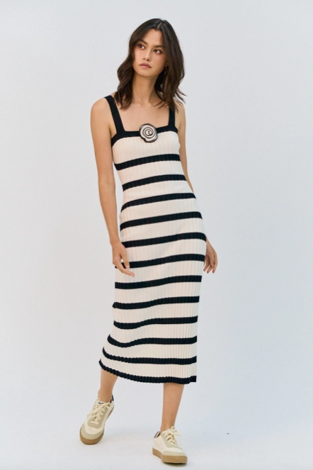 Introducing our Rosette Strip Sleeveless Sweater Midi Dress, an elegant and exclusive addition to your wardrobe. This dress features a rosette and intricate strip detailing, giving it a sophisticated touch. In classic black and white, this dress is a must-have for any fashion-forward individual. Elevate your style with this stunning piece.