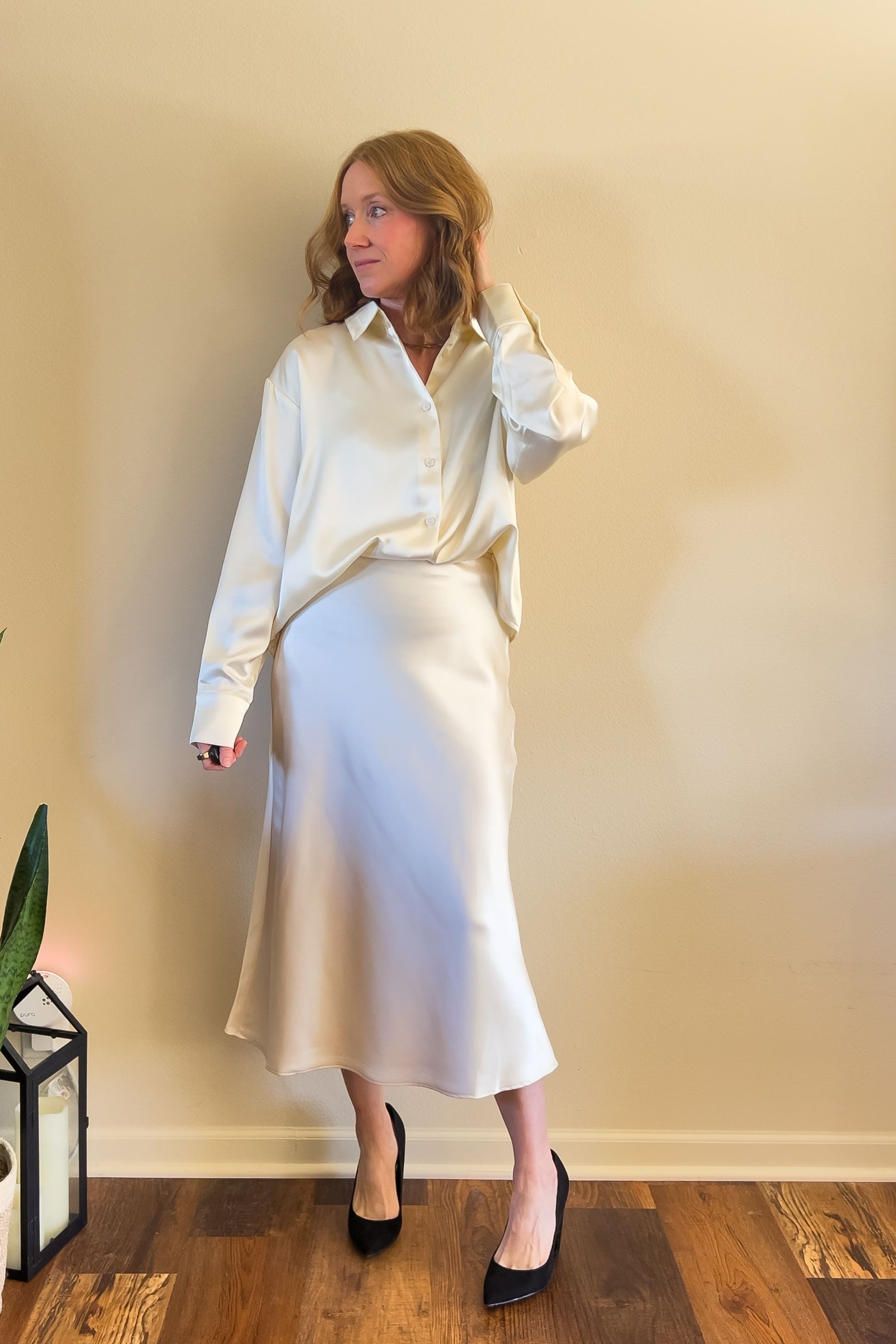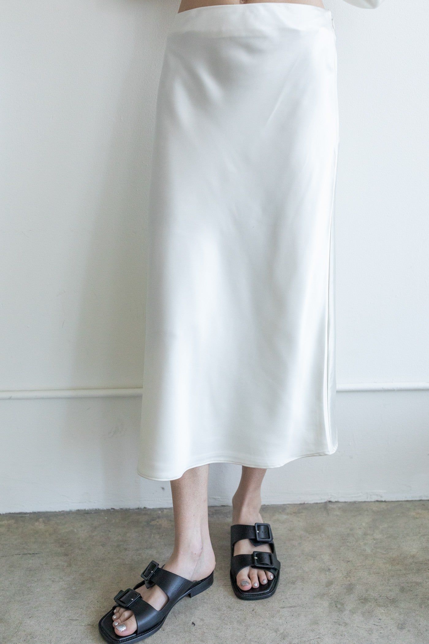 Step into the season with sophistication in this timelessly chic Satin Ivory Midi Skirt. Crafted from exquisitely smooth ivory satin fabric, its classic midi silhouette is luxuriously lined and perfect for styling with delicate blouses for a look that exudes timeless elegance.