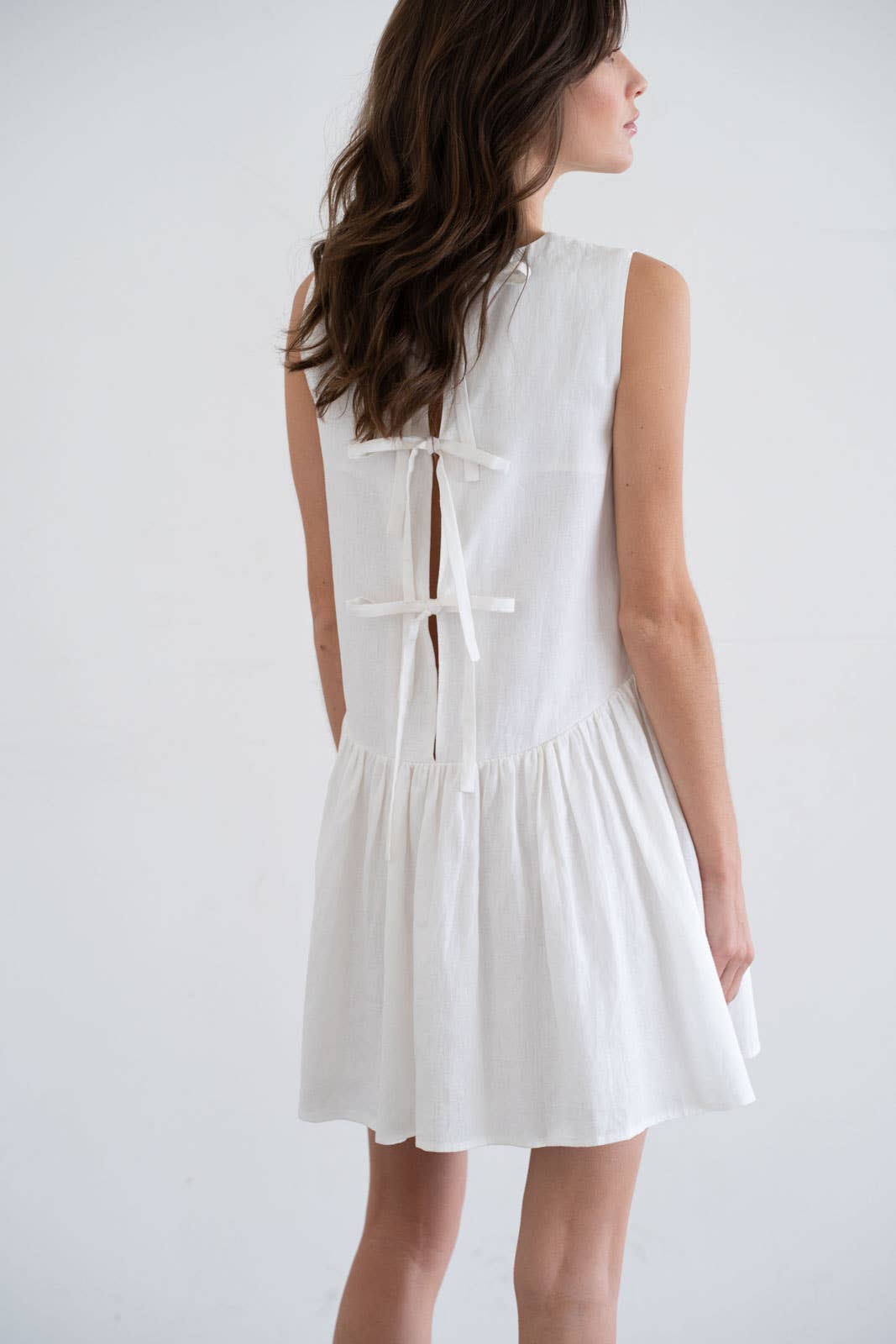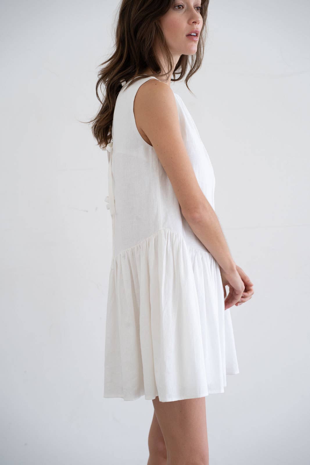 Sleeveless mini dress with relaxed round neckline - Drop waist design with softly gathered skirt - Subtle A-line silhouette offers a breezy shape - Lightweight fabric perfect for warmer days - An easy, versatile piece for everyday or vacation wear.