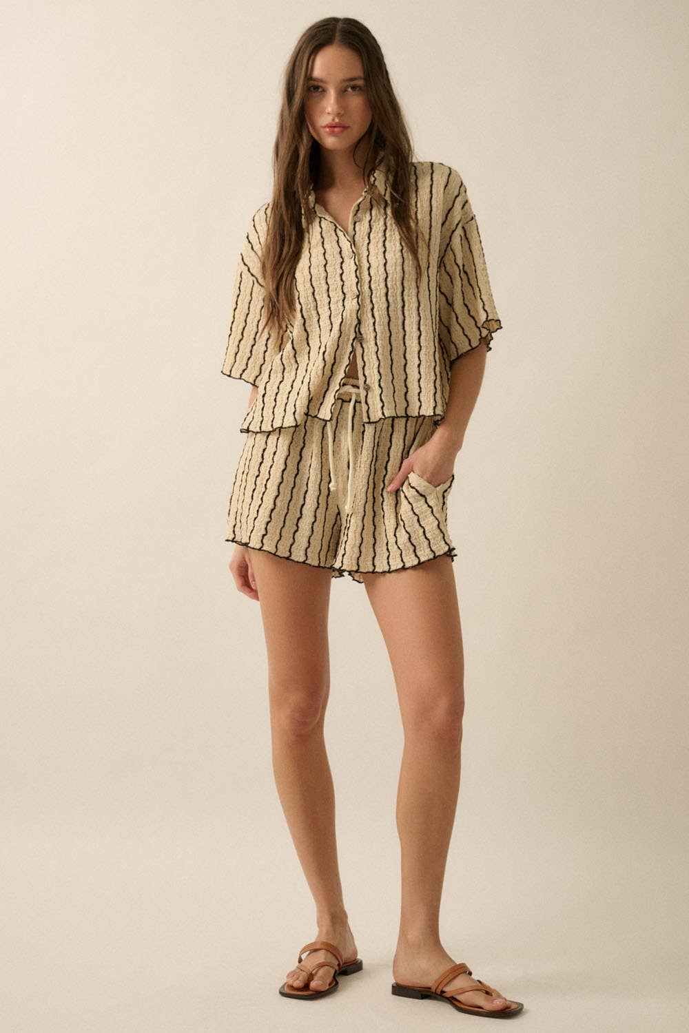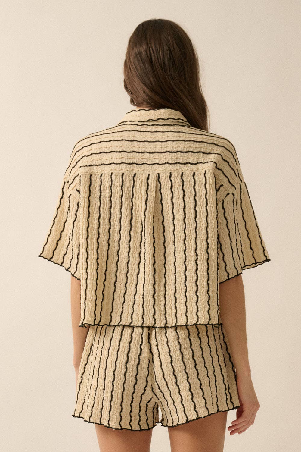 A striped knit shirt with the following features: Textured fabric with lettuce-edge finish throughout. Collared neckline. Button-front closure with coconut wood buttons. Short sleeves. Drop shoulder. Yoke back. Lettuce-edge hem. Don't forget the matching shorts!