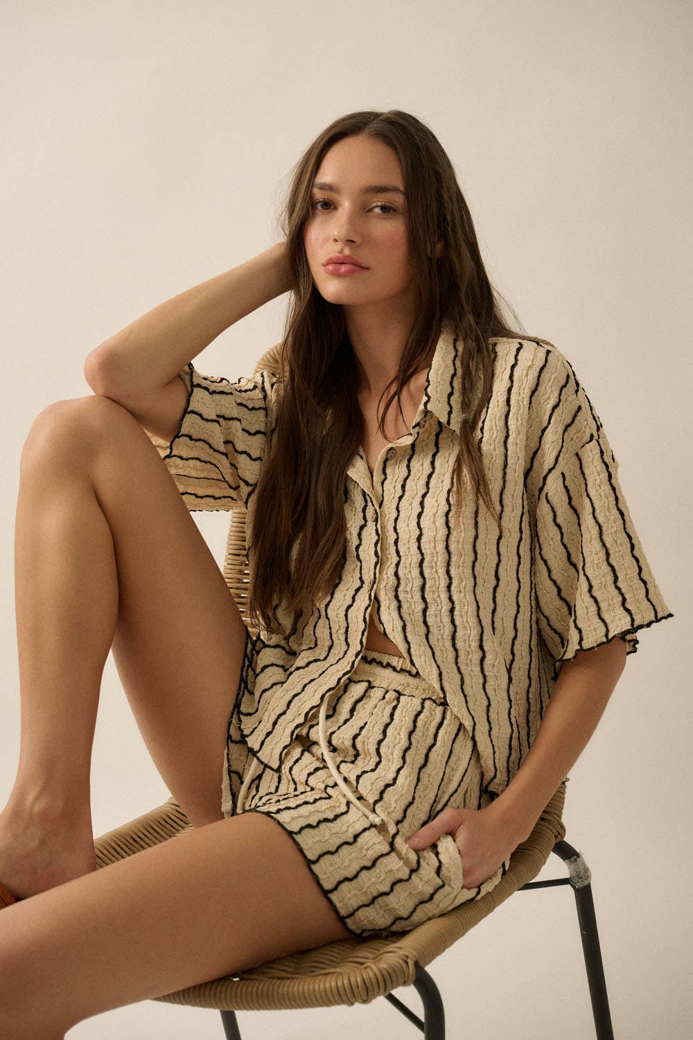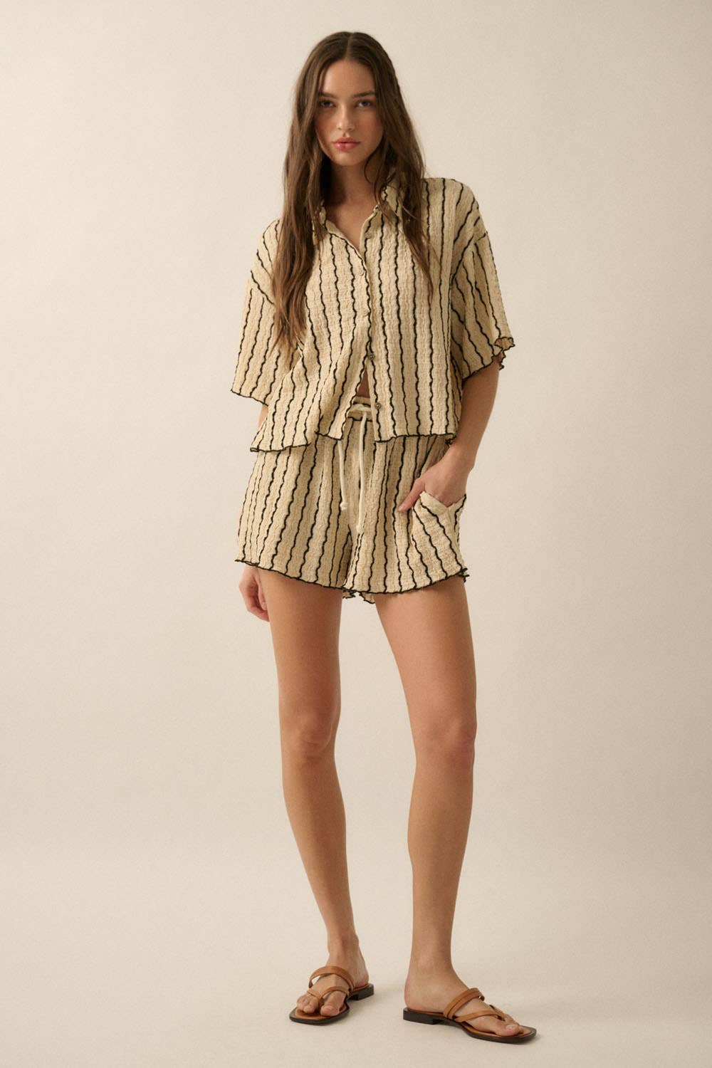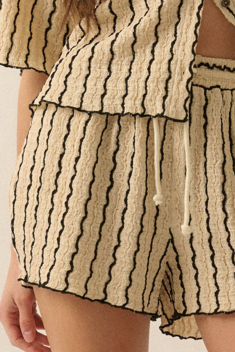 A pair of striped knit shorts with the following features: Textured fabric with lettuce-edge finish throughout. Drawstring elastic waist. Side seam pockets. Wide leg. Lettuce-edge hem. Don't forget the matching shirt!
